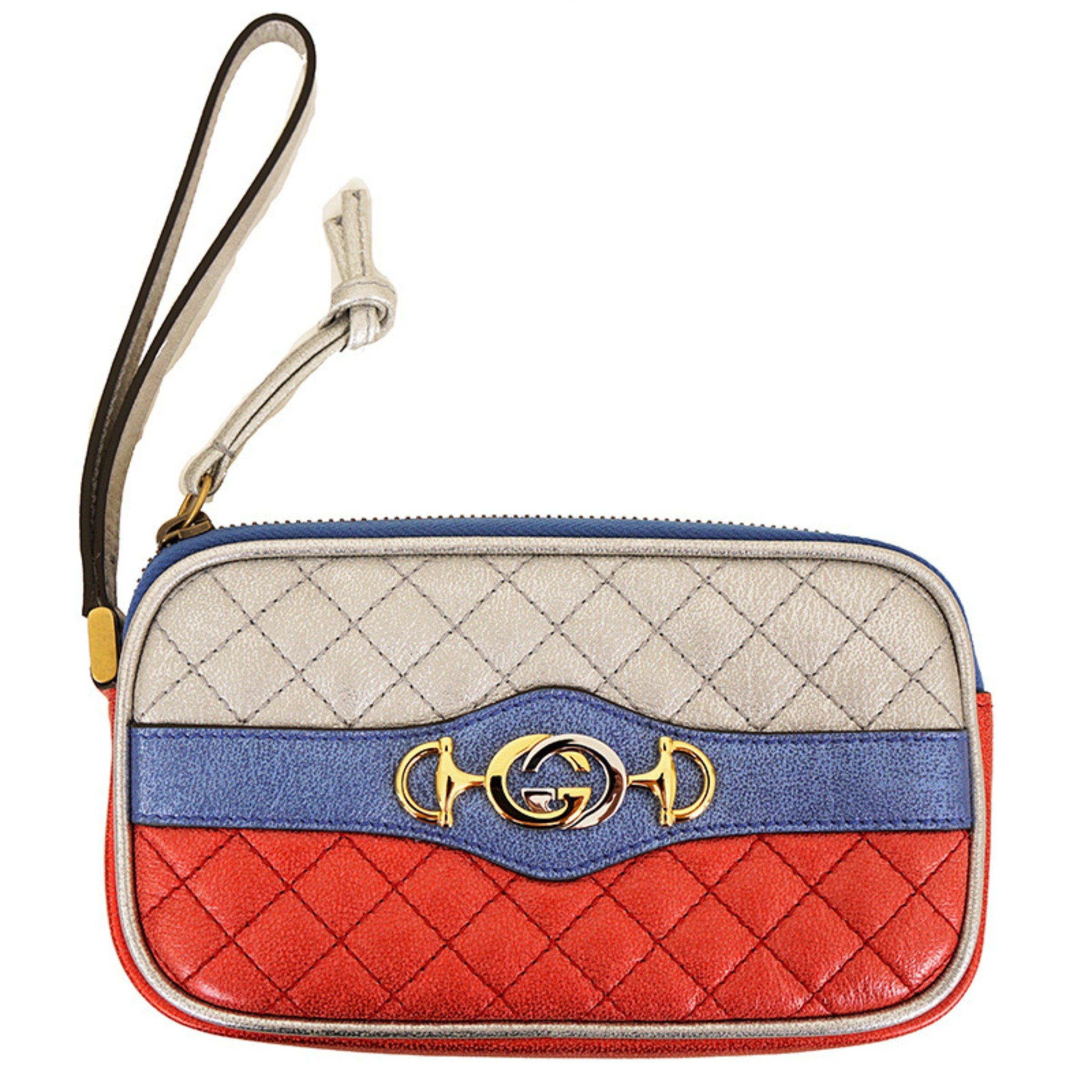 Red, Silver and Blue-tone quilted clutch from Gucci. Size small. Made of leather with metallic sheen. Fastened with zip including leather fringe. Enriched by a silver-tone and gold-tone metal logo featuring signature horsebit at front. Zip pocket at front. Wrist strap. Multicoloured lining is embellished with a floral print. Interior has 1 compartment, 1 zip pocket and 6 card slots. Antiqued gold-tone metal hardware.